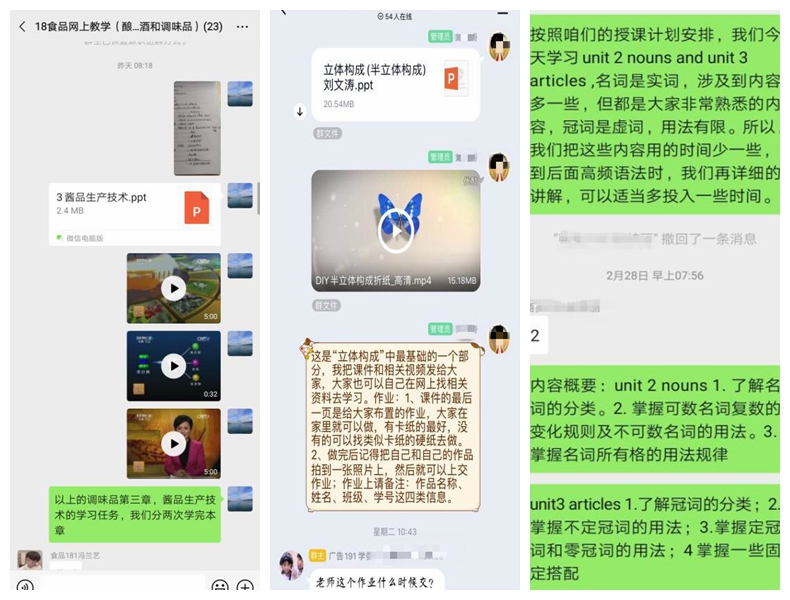 自2月17日开展线上教学以来,高职学院共开出课程171门。任课教师均能引导学生加入教师所要求的课程平台、QQ群、微信群,均在课表时间内授课,并通过各种方式通知学生线上教学组织方式和有关教学要求等;绝大多数教师上传了课件、视频等教学资源,线上教学准备到位。任课教师通过QQ群、微信群、钉钉群、腾讯会议等,采用直播授课、录播授课、混合式、PPT加语音等形式开展线上教学。任课教师认真组织从课前导学、授课、课堂讨论、辅导答疑到布置与批改作业的教学流程。从检查情况看,100%的课程开展了讨论、辅导与答疑,97.76%的课程布置了作业,大多数已完成批改。