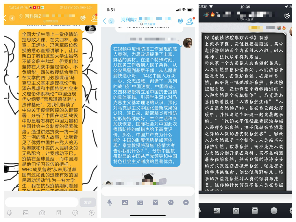 课后集体讨论中,各位同学结合现实生活,纷纷发表了自己的感悟,作为当代社会新青年和社会主义接班人,在疫情防控工作的特殊时刻,虽然不能亲临主战场,但大家坚信在这场大战中只要坚定信心,遵从安排,定能交出合格的答卷。在这个鲜活而有感染力的大课堂上,同学们再次认识到中国人民具有的伟大团结精神,同时也相信本次课堂会让更多的青年学生坚定自己的信仰,做一个无愧于自己、无愧于祖国和人民的时代青年。
