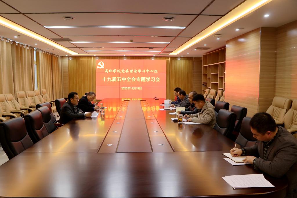 11月18日下午,高职学院党委理论学习中心组在综合楼10楼会议室举行党的十九届五中全会精神专题学习会。会议由学院党委书记王吉田主持。