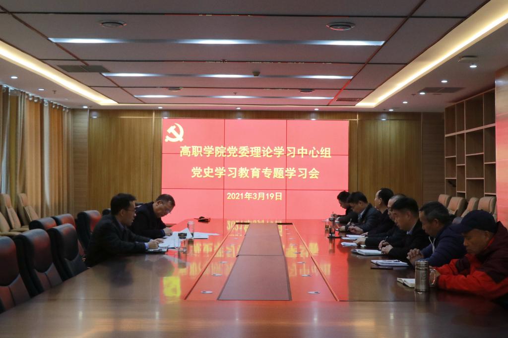3月19日下午,高职学院党委理论学习中心组在综合楼10楼会议室举行党史学习教育专题学习会,全体班子成员参加学习会。会议由党委书记王吉田主持。