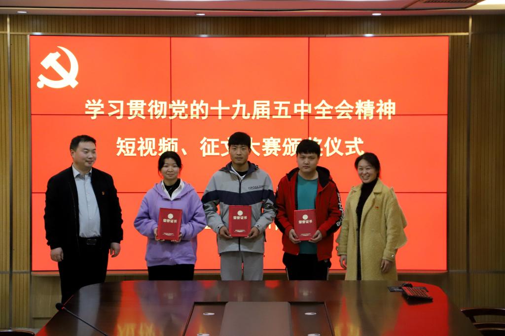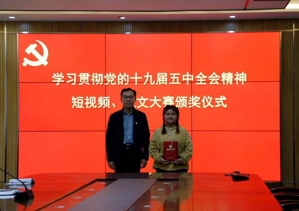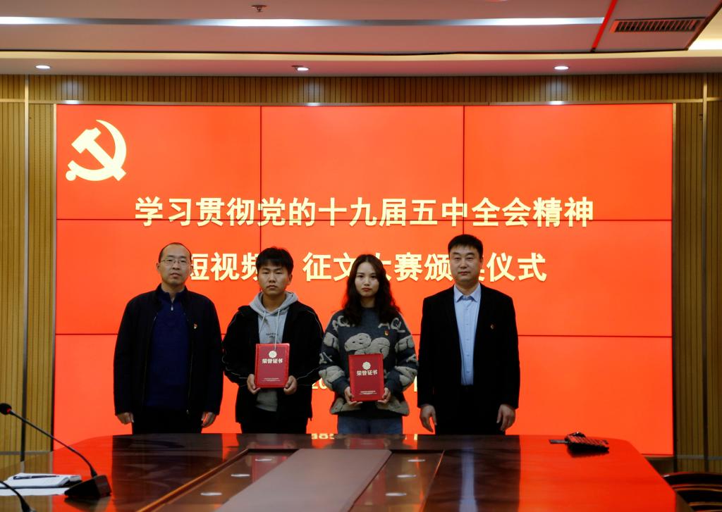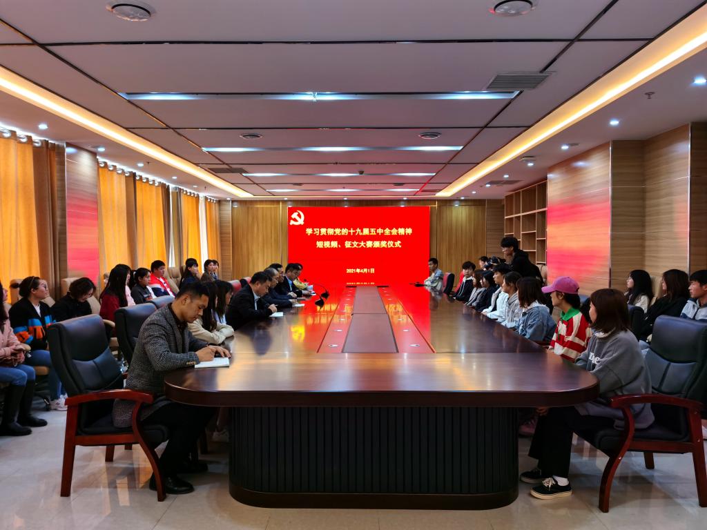 4月1日下午,高职学院在综合楼十楼会议室举行学习贯彻党的十九届五中全会精神短视频、征文大赛颁奖仪式。学院党委书记王吉田,党委副书记孙敬坤、申长奎出席仪式。相关职能科室负责人、各系辅导员和学生代表共50余人参加了仪式。颁奖仪式由申长奎主持。