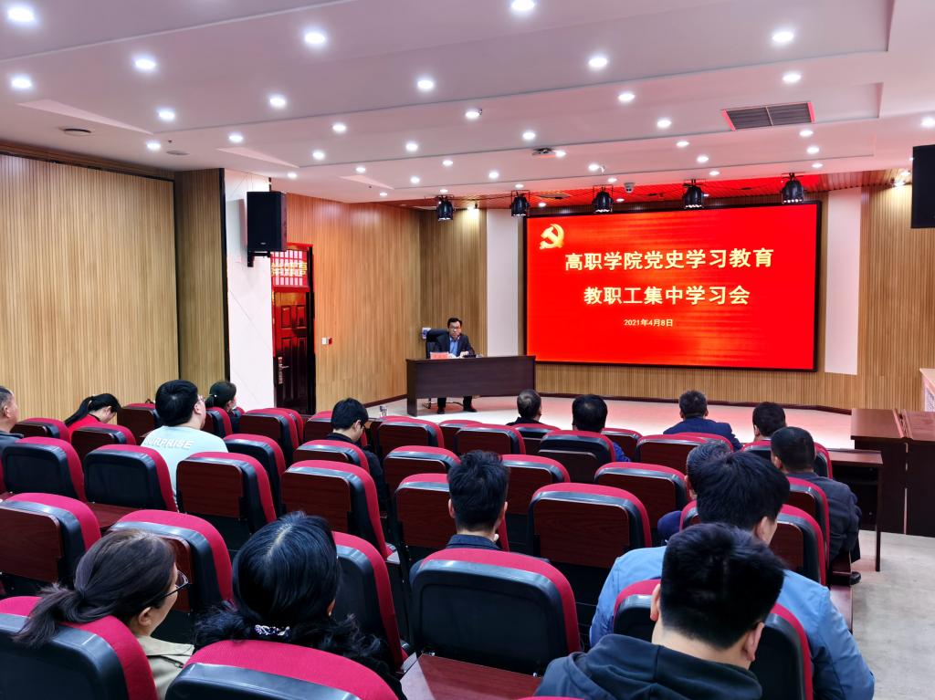 4月8日下午,高职学院在综合楼四楼报告厅举行党史学习教育集中学习会。学院领导班子成员及全体教职工共140余人参加了学习会。学习会由党委书记王吉田主持。