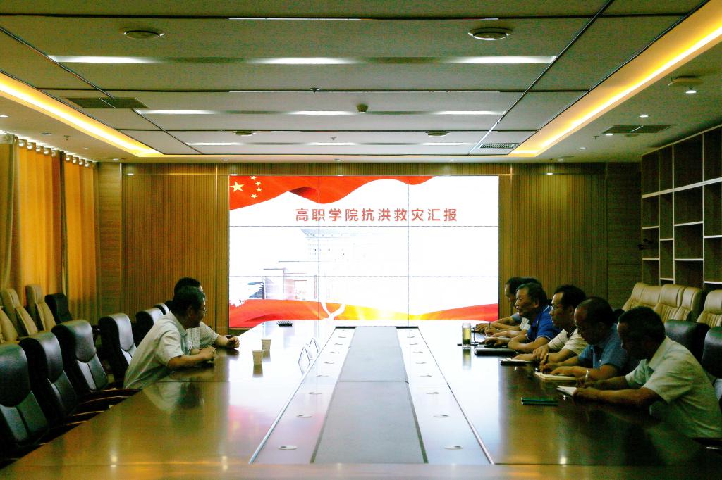 在校内综合楼十楼会议室,高职学院召开了抗洪救灾情况汇报会。学院党政负责人代表全体师生员工向校党委给予的关心和慰问表示感谢,并详细汇报了校内洪水发生状况、教职工抢险救灾过程、洪灾致损及灾后校园恢复建设工作组织开展情况。