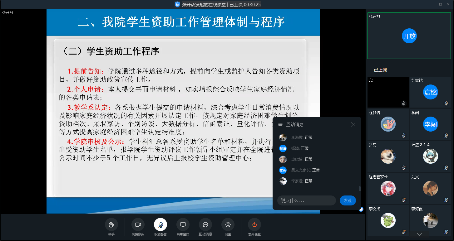 9月13日下午,各系召开线上师生见面会。各系专业课教师向新生介绍了各专业优势和未来发展方向、就业趋势等;辅导员就学生工作、学风建设、校风建设进行了相关阐述,与同学们就学习生活等问题进行了热情交流。