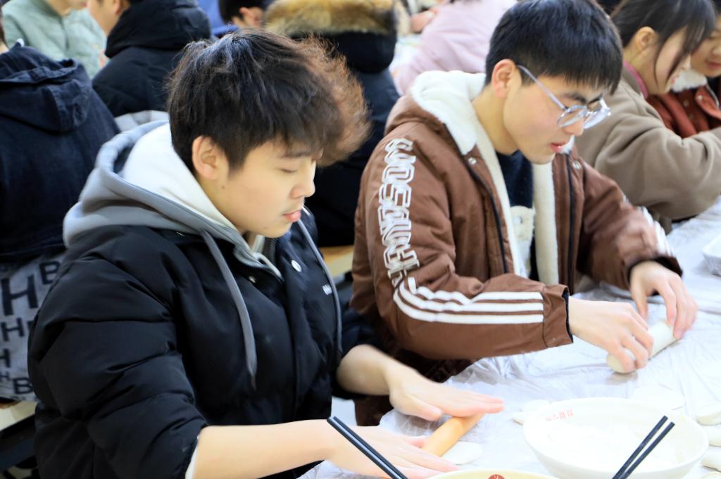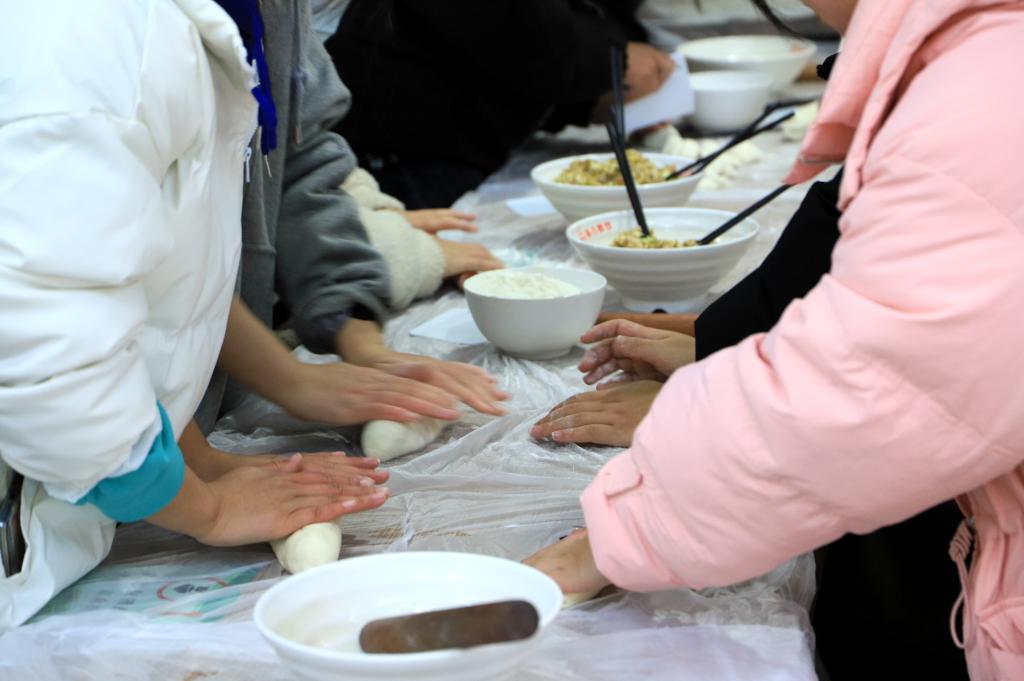 参加活动的师生们早早来到餐厅,分工协作,动作娴熟,各自拿出看家本领,展示高超技巧。现场只见擀面杖翻飞,和面的、拌馅的、切皮的、填料的,大家兴高采烈,普通的面皮经过巧手捏造,呈现出各式各样、活泼可爱的饺子造型,有元宝形、金鱼形、太阳花、小福袋、大麦穗,不一而足,大家的脸上洋溢着兴奋与自豪。部分同学不会包,也迅速被安排上“师傅”,分分钟展示效果宣布“出师”;甚至有的自组战队,向邻座“发起挑战”。