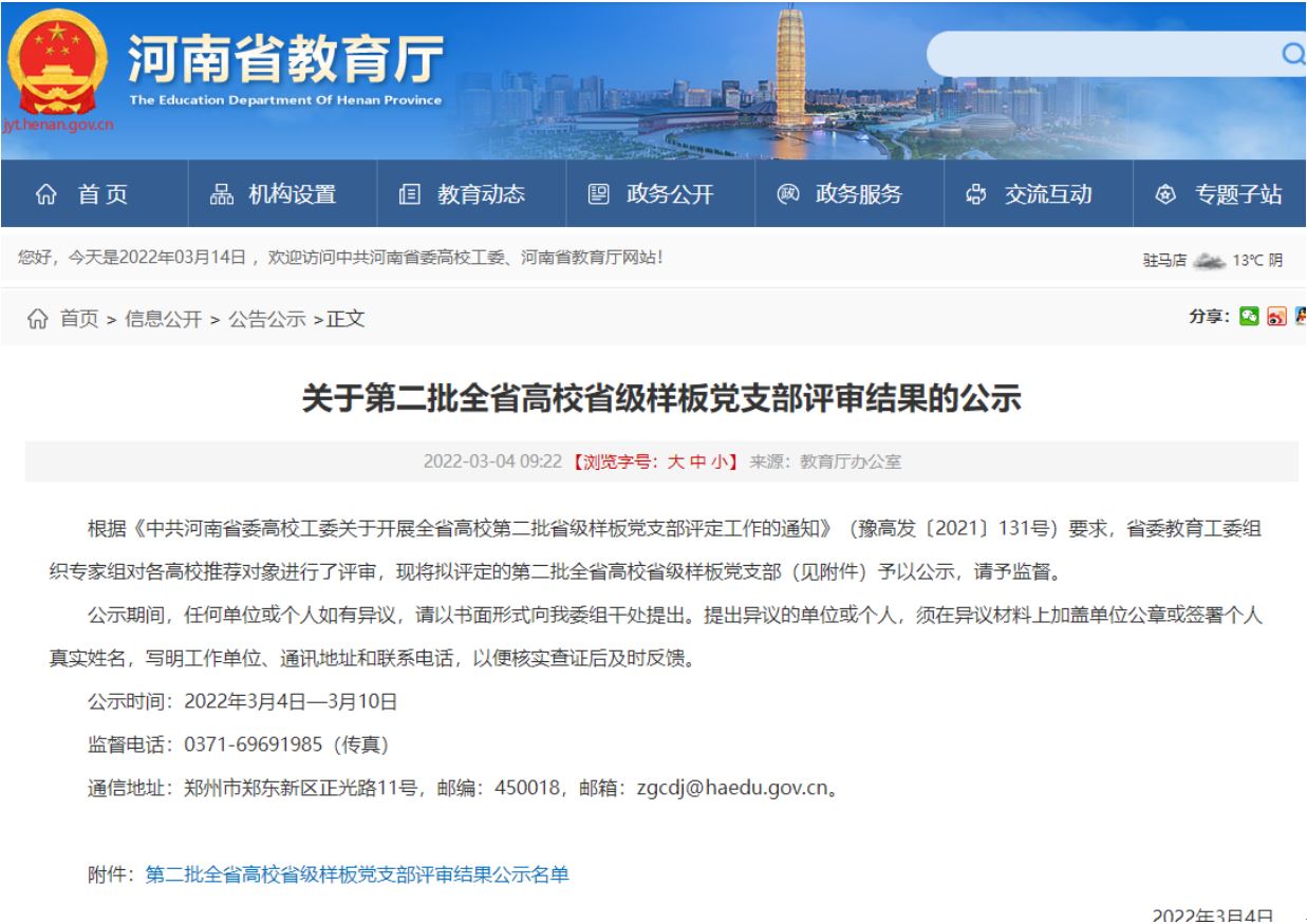 日前,中共河南省委高校工委对第二批全省高校省级样板党支部评审结果进行公示,高等职业技术学院电子信息系党支部名列其中。