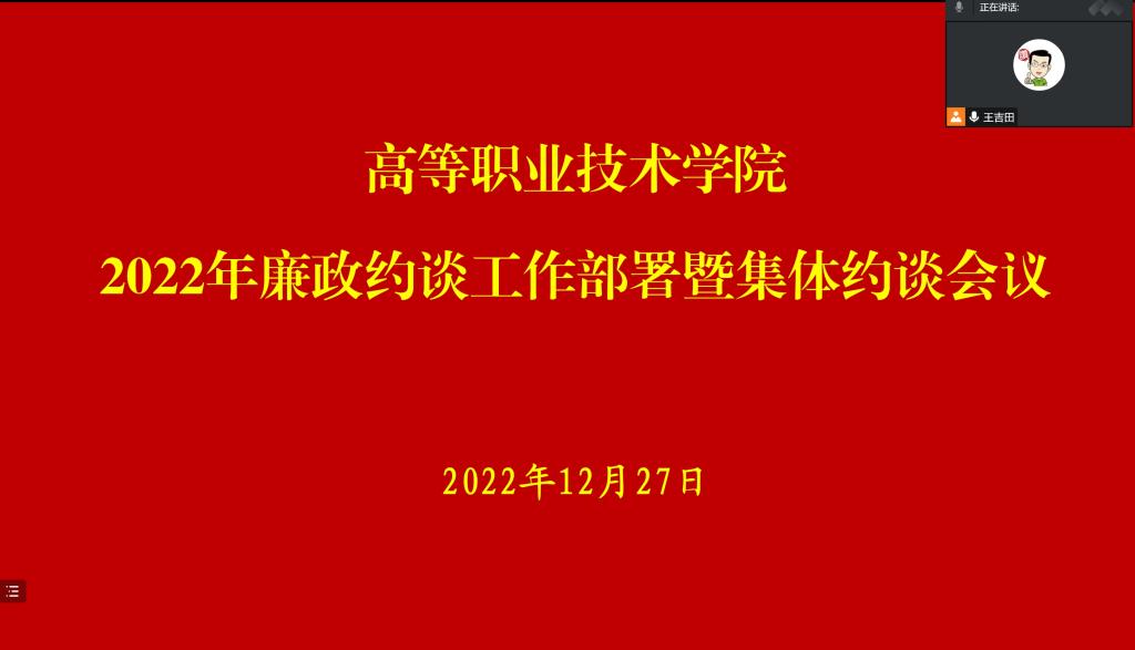 12月27日下午,高等职业技术学院以线上方式召开廉政约谈工作部署暨集体廉政约谈会议。学院领导王吉田、乐玉忠、孙敬坤、申长奎、宋合成、王铁固、李勇超参加会议。