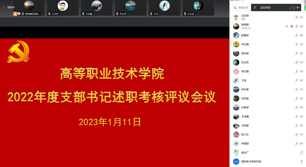 为督促基层党建工作责任落实、推动党支部工作全面进步,1月11日上午,高等职业技术学院以线上方式召开2022年度党支部书记抓党建工作述职考评会议。学院党委委员及各党支部书记、副书记、组织委员、教职工党员代表等共25人参加会议。会议由学院党委副书记申长奎主持。