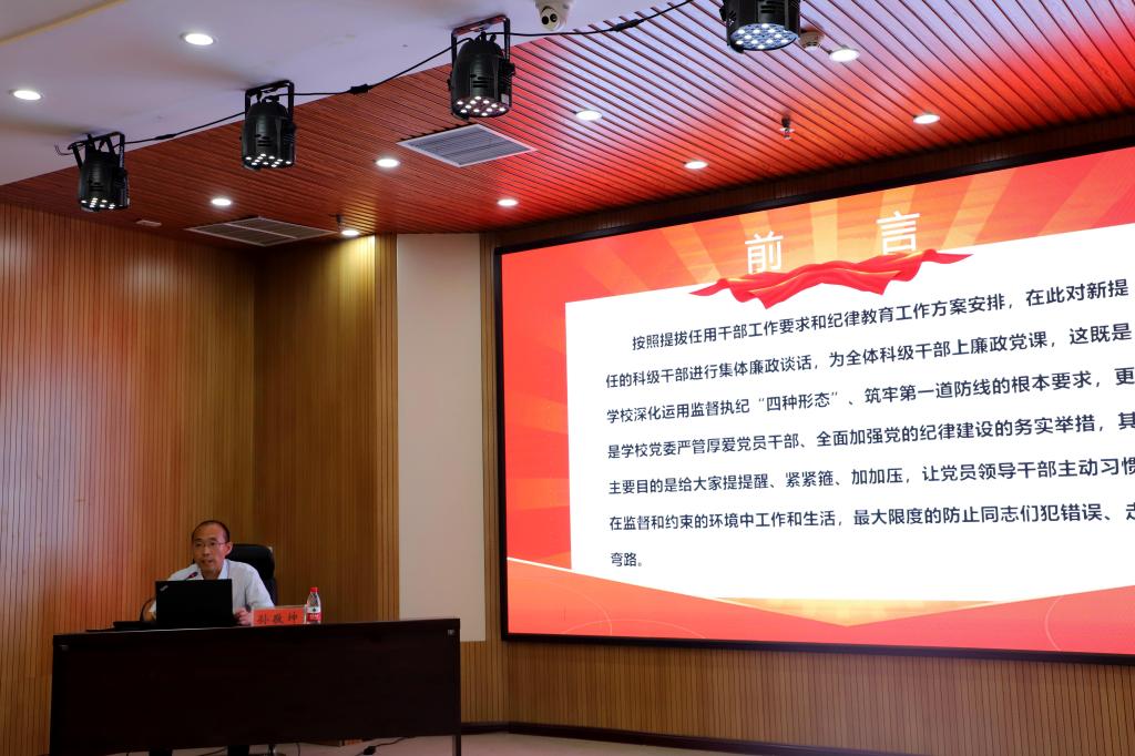 为开展好“明方向、立规矩、正风气、强免疫”专题纪律教育,6月30日下午,高等职业技术学院党委书记孙敬坤在综合楼四楼报告厅对新提任的科级干部进行集体廉政谈话,并为全体科级干部上纪法专题党课。