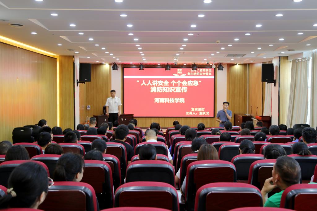 消防安全知识讲座由河南省消防协会的专职教官进行宣讲,为大家详细讲解了火场,特别是高层建筑发生火灾的应变和逃生技能。教官多次强调,火场逃生首先是要熟悉建筑环境,牢记安全出口和疏散通道线路,且发生火灾时生命安全是第一位的,并将火灾现场逃生技能总结为十条,对学生和教职工进行提问和演示。随后又仿真虚拟了火灾现场,进行疏散逃生和灭火技能演练。