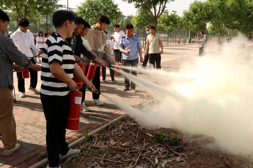 讲座首先播放了近期全国和省内影响巨大的火灾视频,并从火灾的成因和危害入手,讲解了不同火情应该如何冷静应对。讲座后,保卫科和学生科组织学生代表二百余人参加学生宿舍楼逃生演练。工作人员在宿舍楼内设置了烟雾弹,模拟真实的火灾场景。当警报声响起,工作人员、辅导员和宿管迅速到达指定位置,组织学生按照预定的疏散路线有序撤离。之后,师生员工在球场西南空旷区域进行灭火器的实际操作演练。