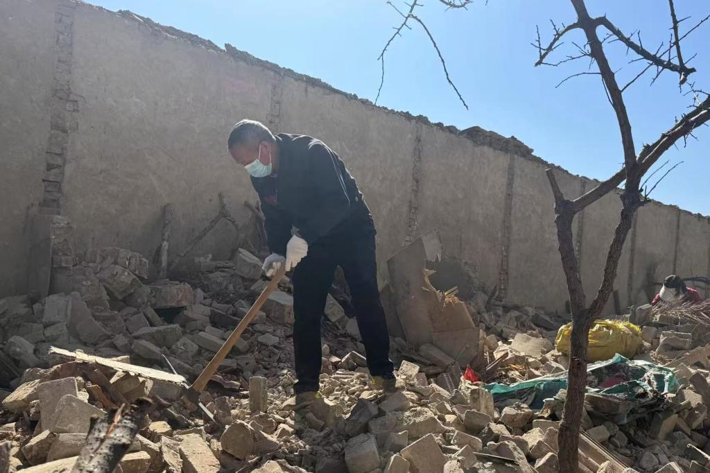 活动拉开帷幕后,大家纷纷领取分配的劳动工具,以党支部为单位井然有序地奔赴指定任务区域。大家齐心协力把倒在路上的大树枝迅速清理完毕,随后展开紧密协作:有的找来水管,给堆积的砖堆喷水降尘,扬起的灰尘在水流的冲击下迅速消散;有的或蹲或坐,手持瓦刀,专注细致地清理旧砖上附着的洋灰水泥;有的戴着线手套,有条不紊,不辞辛劳地运送码放砖块。全体党员分工明确、配合默契、干劲十足,以实际行动践行和传承“百农精神”。