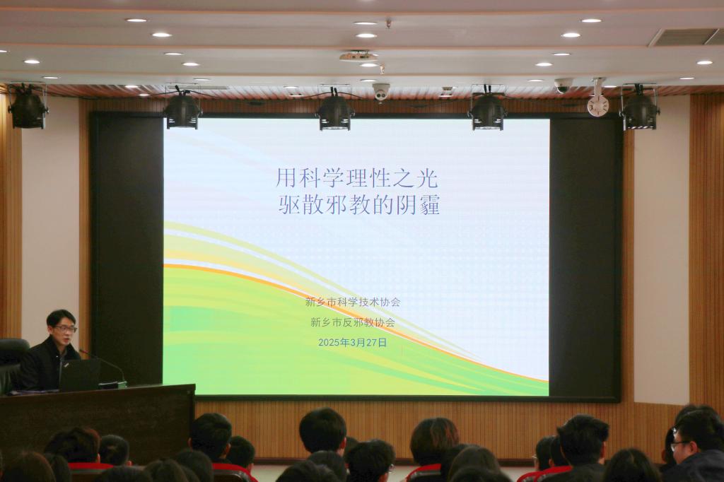 报告会上,赵津首先向大家阐述了邪教的定义、基本特征及其产生的根本原因等一系列相关问题,并运用心理学、社会学理论,剖析邪教利用人们心理弱点进行精神控制的手段。报告还结合高校实际,通过大量真实案例与影像资料,系统揭露邪教组织的运作模式与危害,指导师生如何辨别和抵制邪教。同时,新乡市科学技术协会还在校园设立了咨询台和反邪教警示典型案例展架,并通过发放宣传单页和反邪小礼品等形式,吸引了更多师生的观摩和互动。