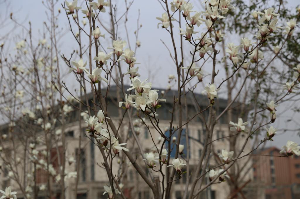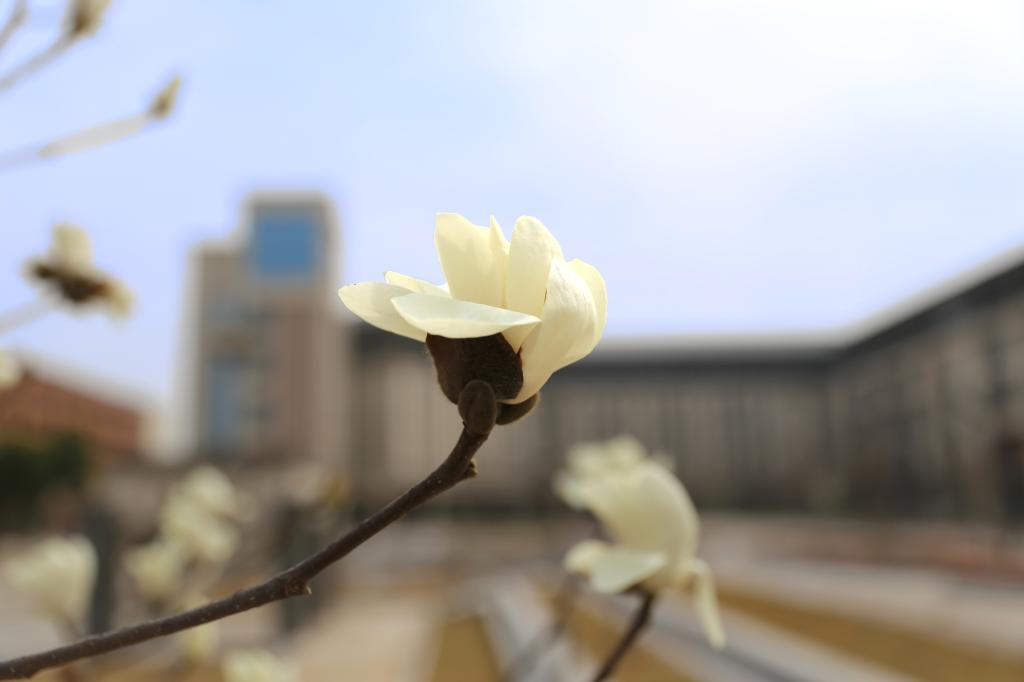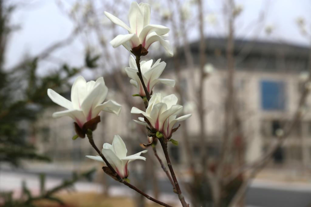 校园的植被开始抽出了嫩芽,仿佛诉说着浓浓的春意;玉兰花也迎着料峭的春风悄然盛开,清新淡雅的香气扑鼻而来、沁人心脾。此情此景甚是美丽!