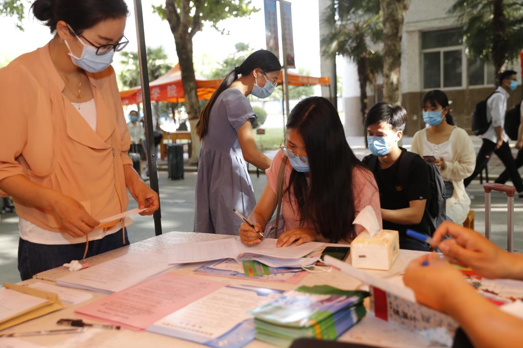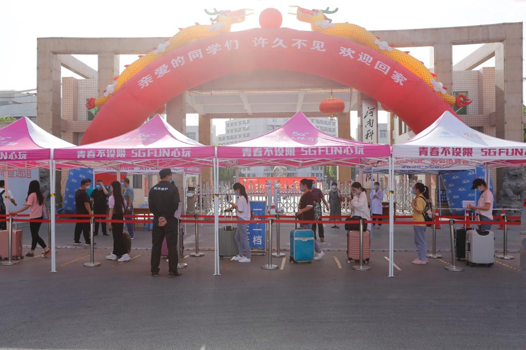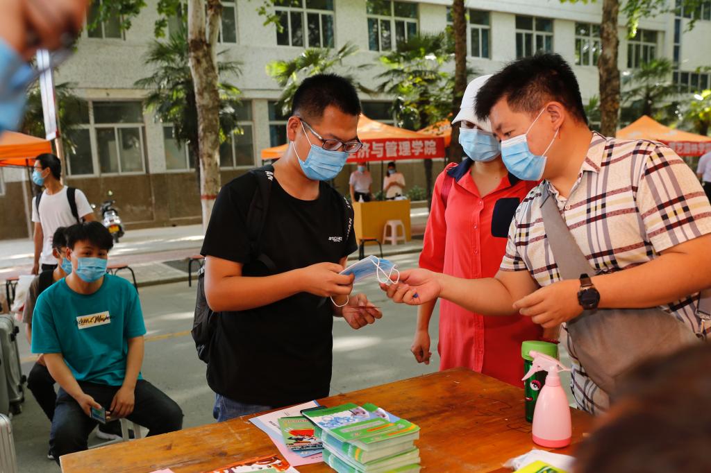 早上7时许,校门口早已设置好了学生返校专用通道,工作人员已全部就位,静待学子归来。在完成身份识别,体温检测,行李消毒等环节后学子顺利进入校园。在学生报到点,各系为返校学生送上口罩、体温计、防控手册等各种防疫物资的健康包,让同学们感到“回家”的温暖。