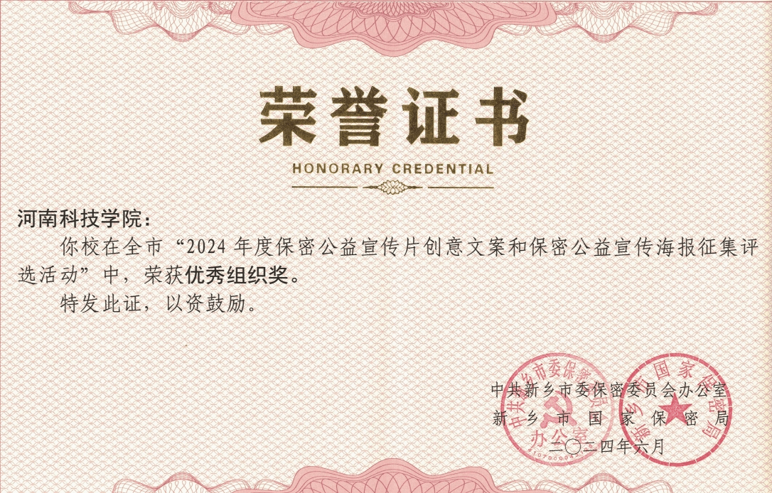 近日,新乡市国家保密局公布了全市保密公益宣传海报征集评选结果,我校选送作品《保密卫士》获得一等奖,《监督者》《三缄其口》《失密之行,受法之刑》等4件作品获得二等奖,周旋、龚颀杨两位老师荣获优秀指导老师,我校获优秀组织奖。其中,作品《保密卫士》作为新乡市公益宣传海报,被统一印制在各县(市、区)和市直各机关单位张贴宣传。