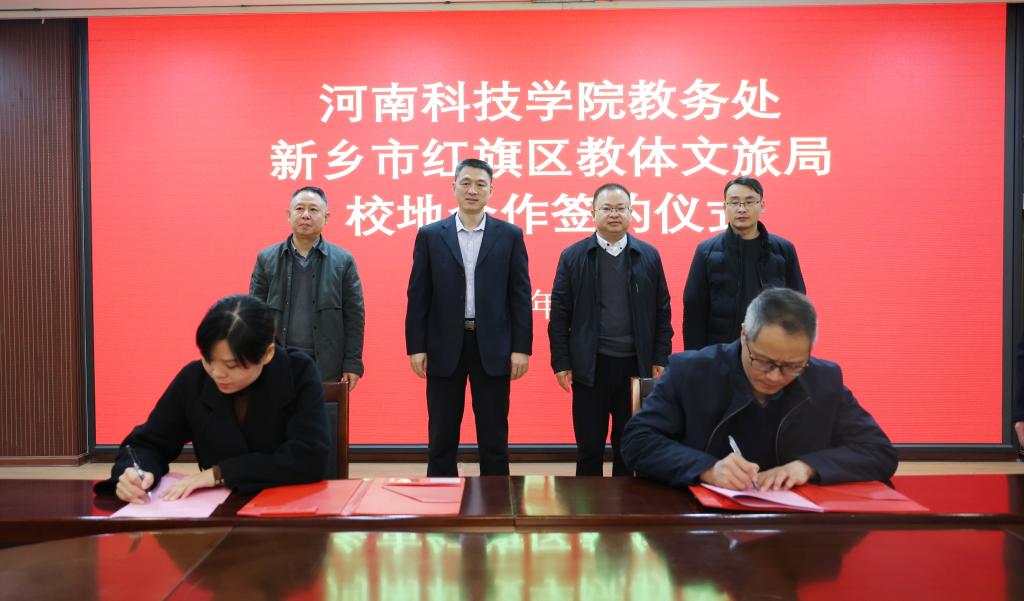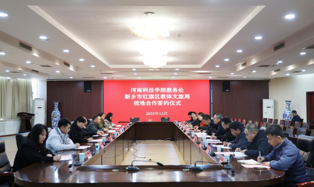 12月7日上午,我校教务处与新乡市红旗区教体文旅局在办公楼206会议室举行校地合作签约仪式。红旗区人民政府副区长张磊、红旗区教体文旅局党组书记段红征、红旗区教体文旅局局长郑鹤鹤以及红旗区教体文旅局有关人员参加签约仪式,学校党委组织部、校团委、教务处、教育培训中心、食品学院、园艺园林学院、文法学院、教育科学学院、数学科学学院、外国语学院、体育学院负责人参加了仪式。会议由党委组织部负责人主持。