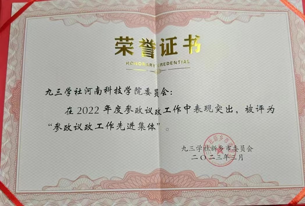 我校九三学社委员会被授予“参政议政工作先进集体”荣誉称号,姚素梅、周凯被评为“社内监督工作先进个人”,余昊被评为“思想宣传先进个人”,周凯、贺栋被评为“参政议政工作先进个人”, 徐泮被评为“社会服务先进个人”。第二支社主委周凯撰写的《建议重视河南省农业碳排放问题》被河南省政协采纳。
