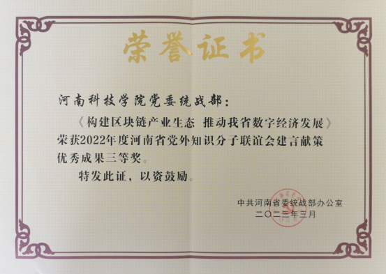 近日,由河南省党外知识分子联谊会举办的2022年度调研课题征集活动评审结果揭晓。我校民建会员杨景旗、吴国庆、胡国锋撰写的调研报告《构建区块链产业生态 推动我省数字经济发展》获得2022年度河南省党外知识分子联谊会建言献策优秀成果三等奖。