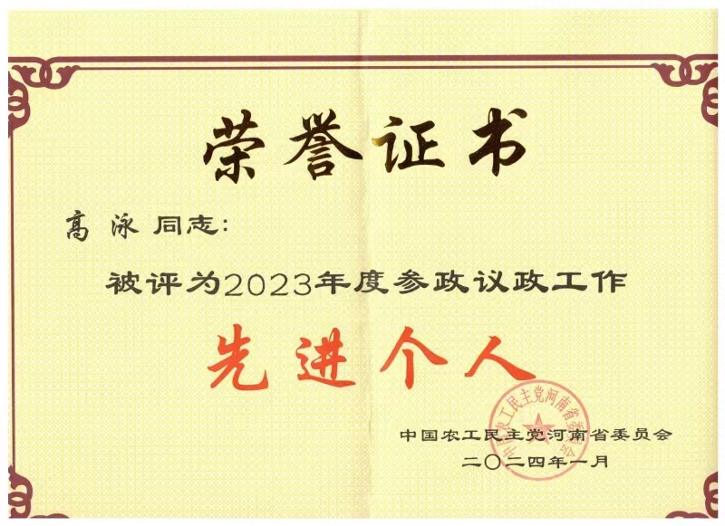 近年来,在校党委的正确领导下,我校农工党支部立足本职工作,积极履职尽责,服务国家战略,围绕河南省经济社会发展和人民群众关注的热点、难点问题深入开展调查研究,提出了许多优秀的参政议政成果,受到广泛好评。2023年,高泳同志被授予政协新乡市委会优秀政协委员、中国农工民主党河南省委员会2023年度参政议政工作先进个人。