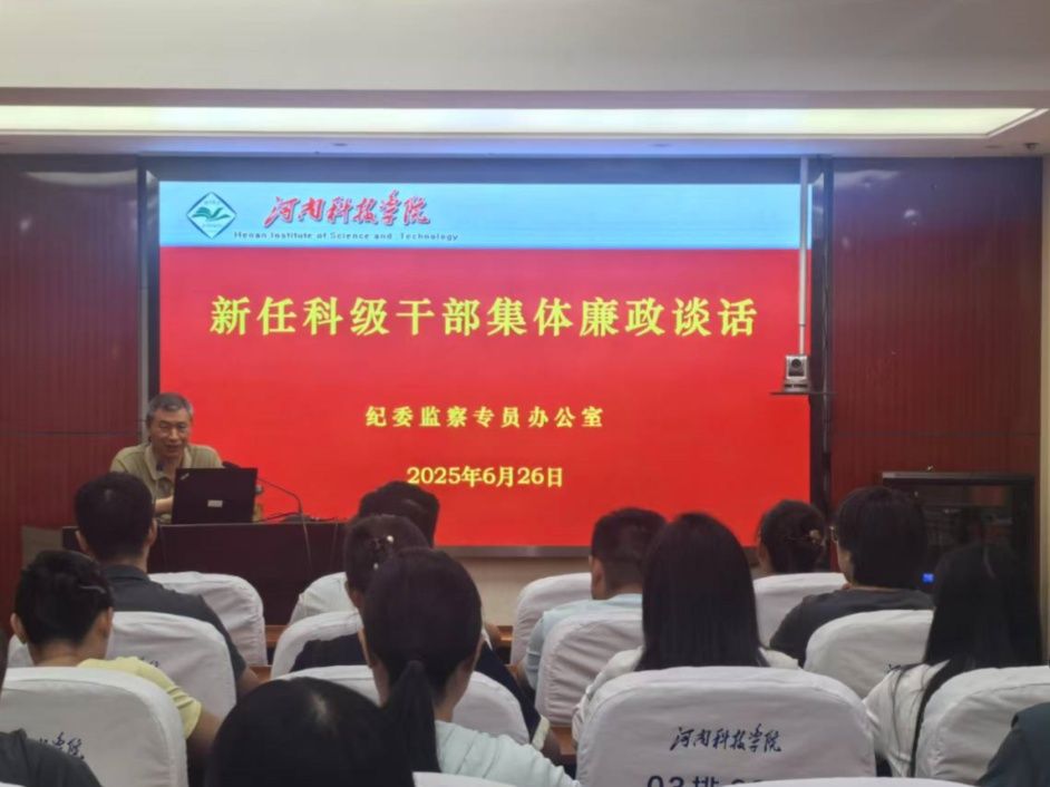 6月26日,校纪委副书记、综合室主任张玉新在办公楼701会议室,以“坚定信念、砥砺品格,守好‘铁规矩、硬杠杠’”为题,对2025年新任科级干部开展廉政谈话,为干部廉洁履职系紧“第一粒扣子”。
