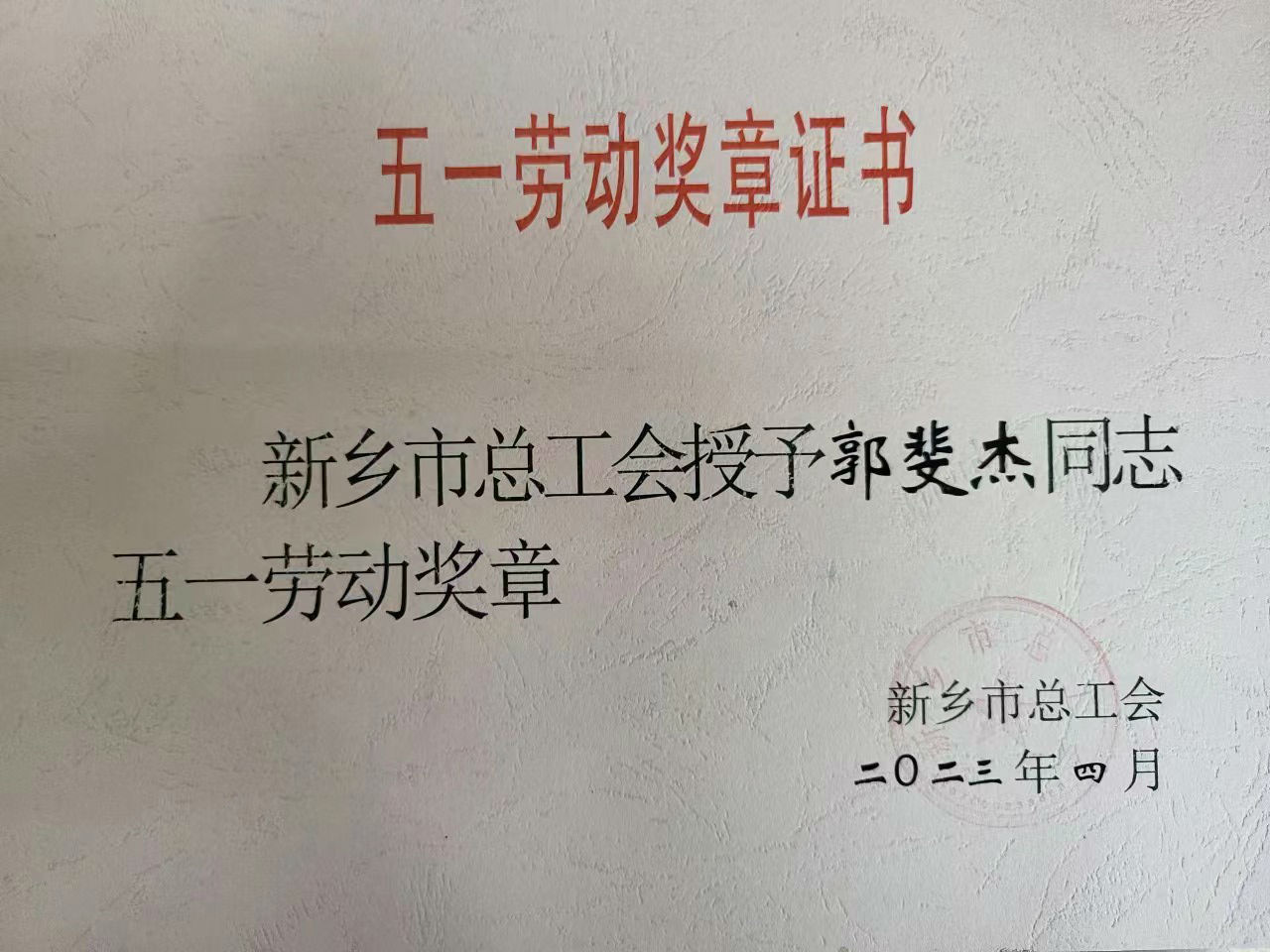 2023年“五一”劳动节,新乡市总工会命名表彰了一批先进集体和个人,我校子弟学校校长郭斐杰老师荣获“新乡市五一劳动奖章”。