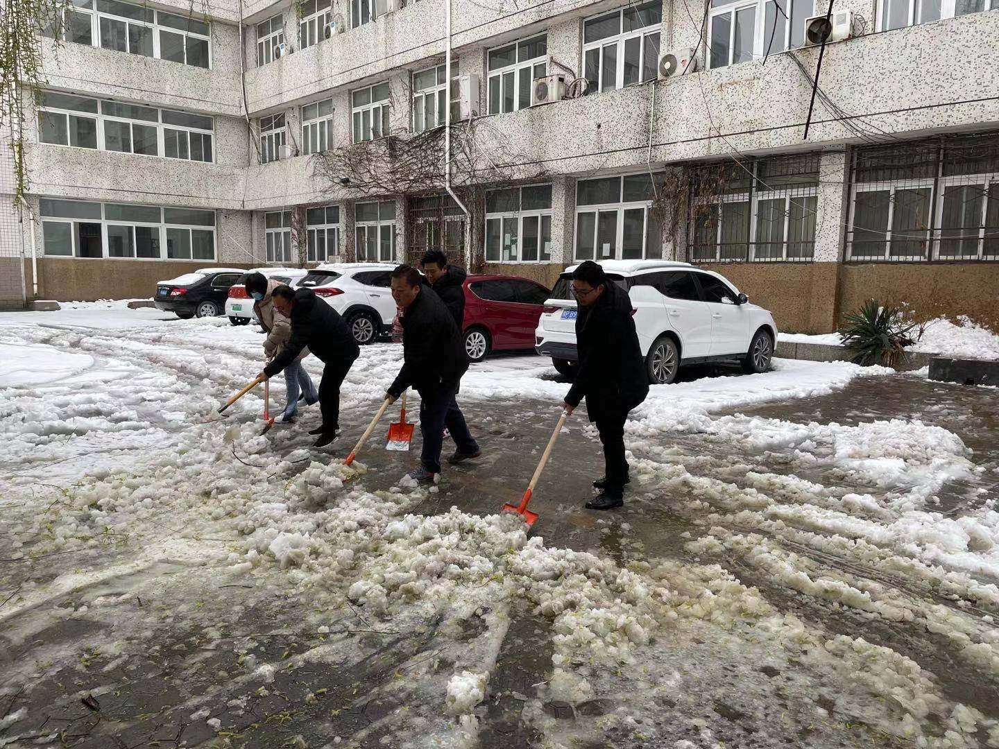 由于气温变化,积雪很大部分已经变成了冰渣,增加了除雪难度,而现成的工具只有铁锹和扫帚。校团委党支部同志们不畏严寒、齐心协力、你铲我扫、密切配合,经过近两个小时的奋战,把地面上的积雪和冰渣清扫至花坛中。尽管室外温度很低,大家的手脸冻得通红,但大家干得热火朝天,在欢声笑语中扫出了畅通的车道和干净的广场。