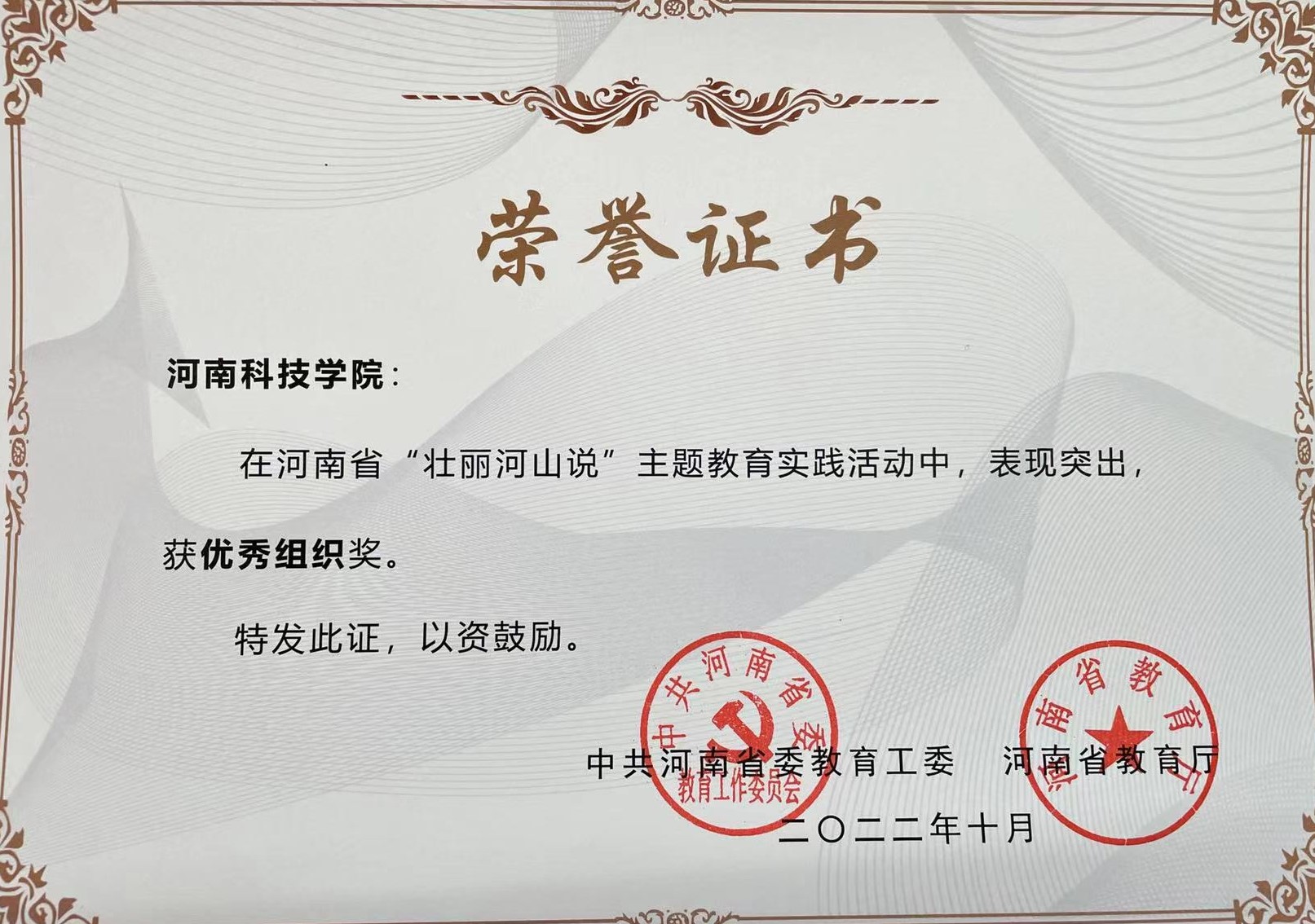 近日,中共河南省委教育工委、河南省教育厅办公室下发《关于公布“壮丽河山说”主题教育实践活动获奖结果的通知》。我校荣获“优秀组织奖”,我校教师袁博、王占魁分别获“先进个人”和“优秀指导老师”奖,文法学院学生彭鑫获“人气之星”奖。