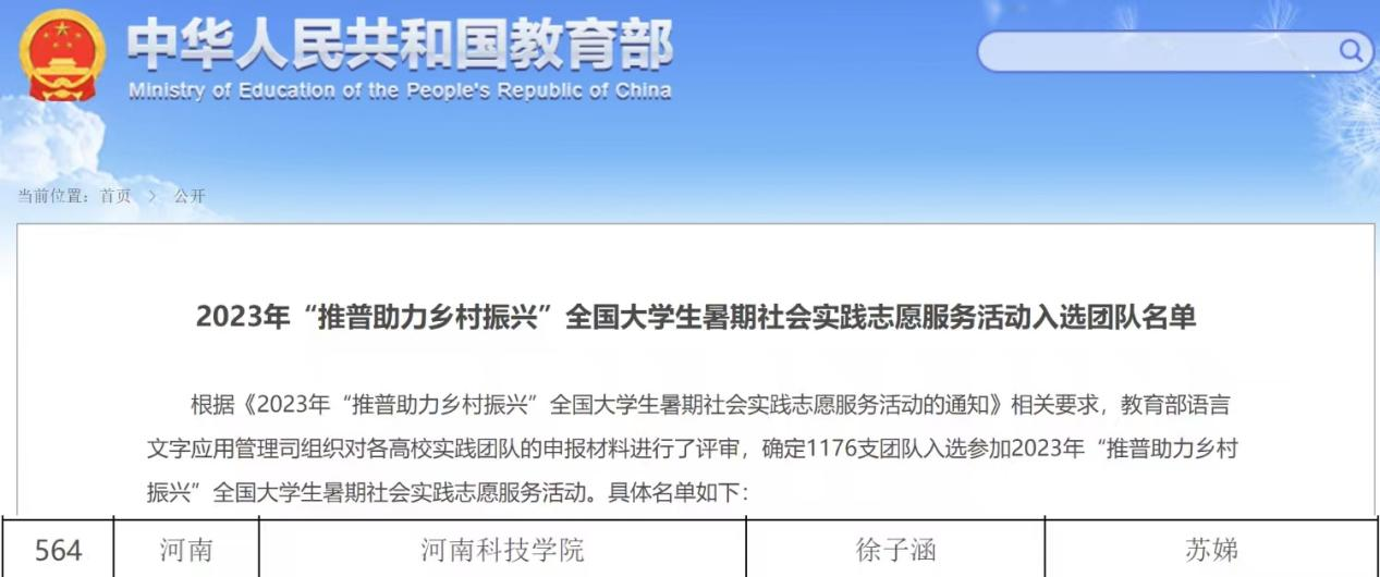 自活动通知发布以来,校团委精心组织,各学院积极发动、认真组织申报。经过校内初选和教育部终审,最终苏梅国际学院“河南科技学院文化邮递推普振兴乡村服务队”入选参加2023年“推普助力乡村振兴”全国大学生暑期社会实践志愿服务活动。