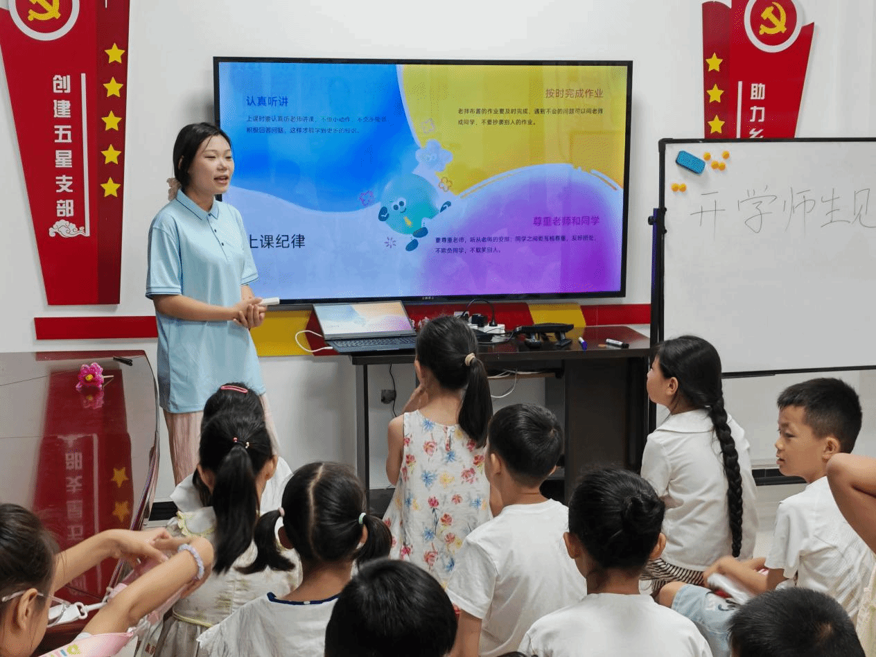 团队抵达后,省委组织部驻西赵桥村第一书记韩小平带领驻村工作队队员及村“两委”班子成员与支教团队进行了工作对接。韩小平对支教团队的到来表示欢迎。外国语学院团委书记、带队老师张慧向驻村工作队和西赵桥村委会为本次暑期大学生支教活动给予的支持表示感谢,介绍了“甘霖计划”大学生义务支教服务队根据不同学生的实际情况制定的教学计划、活动安排以及教学物资的准备情况等。支教团队将分班采用不同的教学方式进行授课,内容涵盖学习普通话、英语基础学习等文化课程;以榜样学习宣讲、共唱红色歌曲等爱国主义教育课程;以交通安全、食品安全、防溺水等为主的生命教育、安全自护教育课程;以音乐、美术、手工、舞蹈为主的兴趣爱好课程……