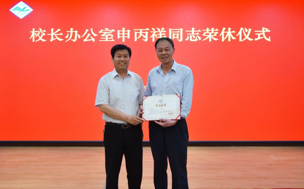 校长办公室主任张彦军代表学校向申丙祥同志发放荣休证书并感谢他为学校和校办所作贡献,希望全体人员要学习申丙祥同志不怕吃苦、勤恳敬业、任劳任怨的工作态度,为学校发展作出新贡献。
