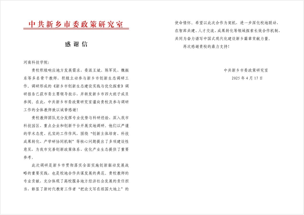 近日,中共新乡市委政策研究室向我校发来感谢信,对我校积极参与新乡市创新生态调研工作给予了高度评价并表示衷心感谢。