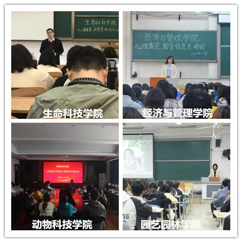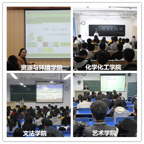 培训内容包括心理委员和宿舍信息员的角色定位、工作职责和工作方法、开展心理主题班会的方法和形式、大学生心理健康标准、如何鉴别心理正常和异常、不同类型心理问题的诊断知识与干预措施、危机事件心理干预、生命教育等等。