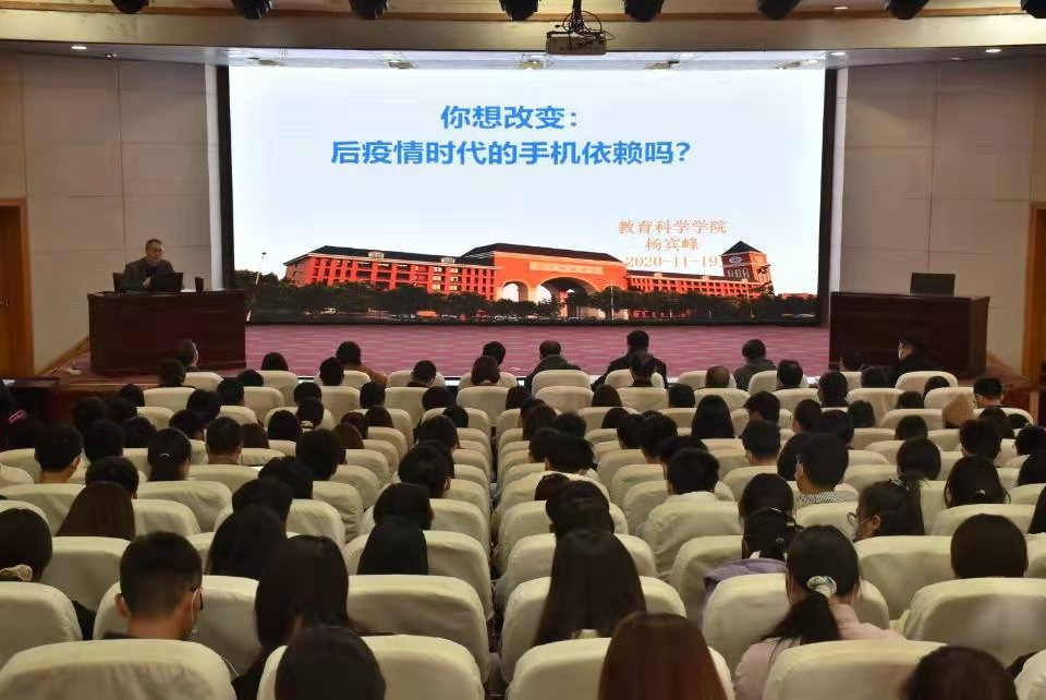 为贯彻习近平总书记在全国高校思想政治工作会上关于培育理性平和的健康心态、加强人文关怀和心理疏导的指示精神、贯彻落实立德树人根本任务、加强我校心理健康教育工作,11月19日上午,大学生心理健康教育与指导中心邀请教育科学学院院长杨宾峰教授在图教201作了题为《你想改变:后疫情时代的手机依赖》的专题讲座。党委学工部、学生处、各学院党委副书记、全体辅导员及学生心理委员300余人参加了会议。会议由学生处副处长张晓云主持。