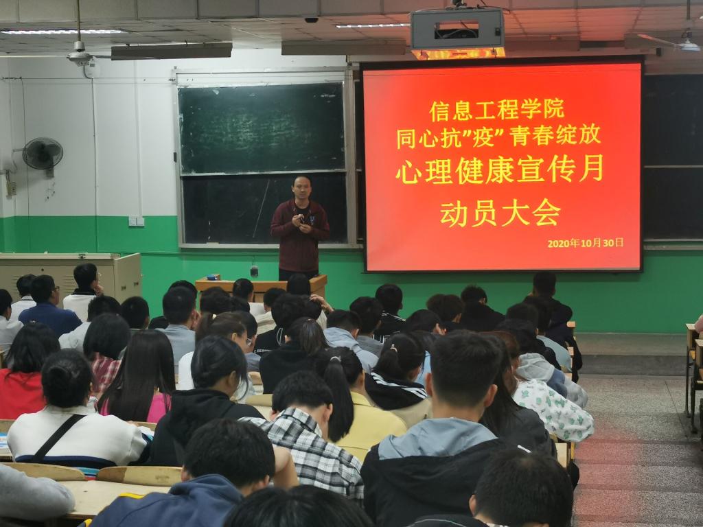 在心理健康活动月期间,信息工程学院为提高学生对心理健康的了解和认识,举办心理健康宣传月动员大会,提高学生对心理健康的重视,通过制作心理主题展板、悬挂条幅营造良好的氛围;举办心理电影赏析、朗诵比赛、心理漫画大赛和心理知识竞赛提高学生心理健康的相关知识,丰富学生的学习生活。组织新生参观校心理中心,让学生了解心理咨询的基本程序。通过举办系列活动,加强了对学生心理健康的指导,帮助他们以健康良好的心态开启美好的大学生活。