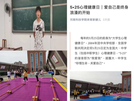 为加强大学生心理健康教育工作,提高学生的心理健康水平、优化心理品质,促进大学生身心健康和谐发展,围绕5·25“大学生心理健康日”,体育学院开展系列活动:一是加强宣传,营造氛围。通过微信公众号、qq群发布心理健康日相关内容,分享心理调节小贴士,营造心理健康教育良好氛围。二是积极参与“我爱我心理健康”大型素质拓展活动,关注心灵成长。三是召开心理健康教育主题班会。进一步引导学生健康成长,保持良好积极心态。通过系列活动,同学们对“大学生心理健康日”有了更全面的认识和了解,学会更好地去爱自己、爱他人。