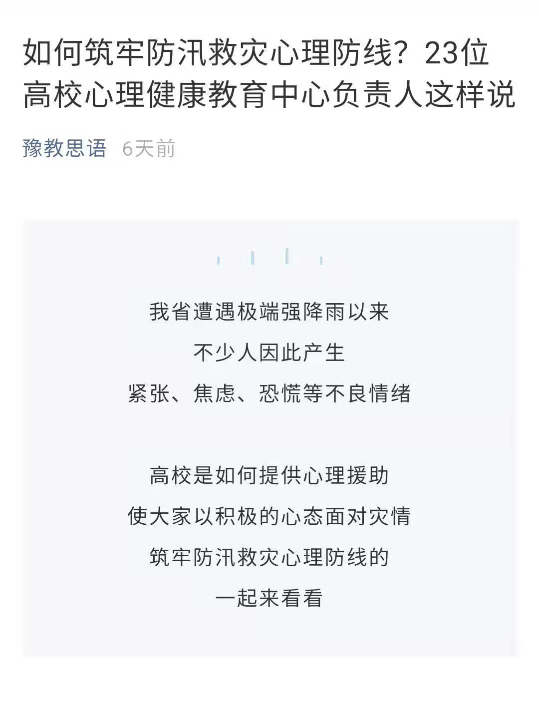 灾情发生以来,我校一方面积极行动,同时主动思考,提出了我校心理中心的援助思路。近日,河南省教育厅“豫教思语”微信公众号报道了我校心理中心负责人张晓云提出的援助措施。