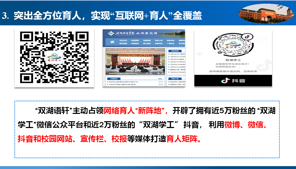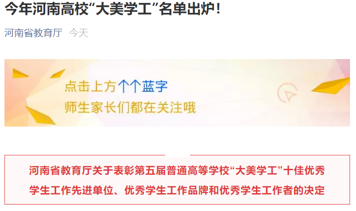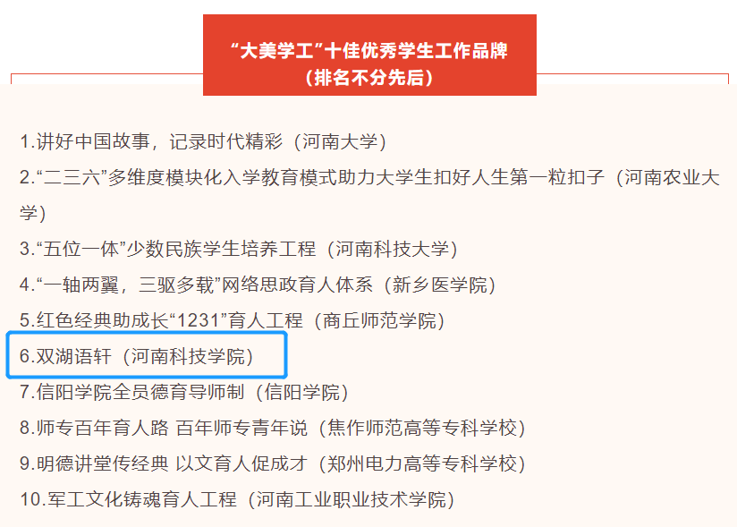 近日,河南省教育厅官方媒体发布了《关于表彰第五届普通高等学校“大美学工”十佳优秀学生工作先进单位、优秀学生工作品牌和优秀学生工作者的决定》,我校“双湖语轩”喜获河南省第五届“大美学工”十佳优秀学生工作品牌。