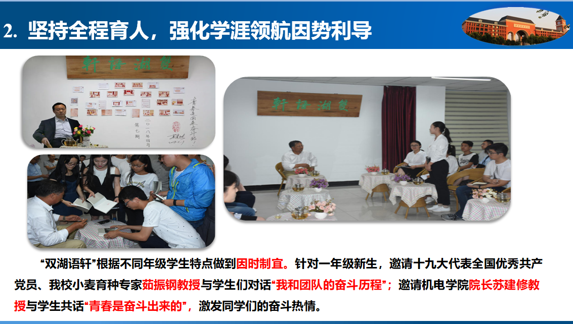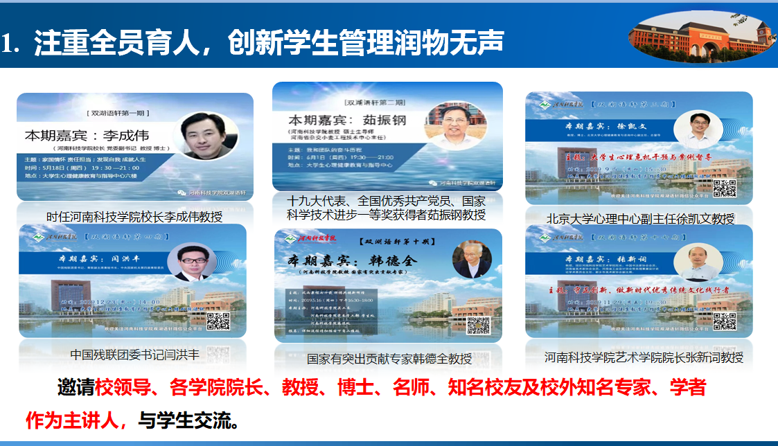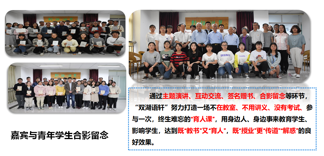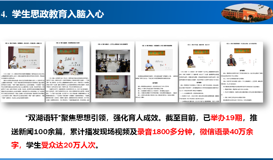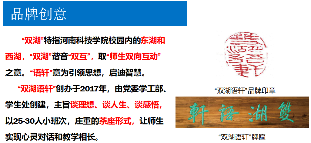 近年来,在校党委的正确领导下,我校学生工作坚持以立德树人为根本,以理想信念教育为核心,以社会主义核心价值观为引领,以学生成长成才为中心,注重特色创意,狠抓品牌创建,创新培育了“双湖语轩”学生工作品牌。