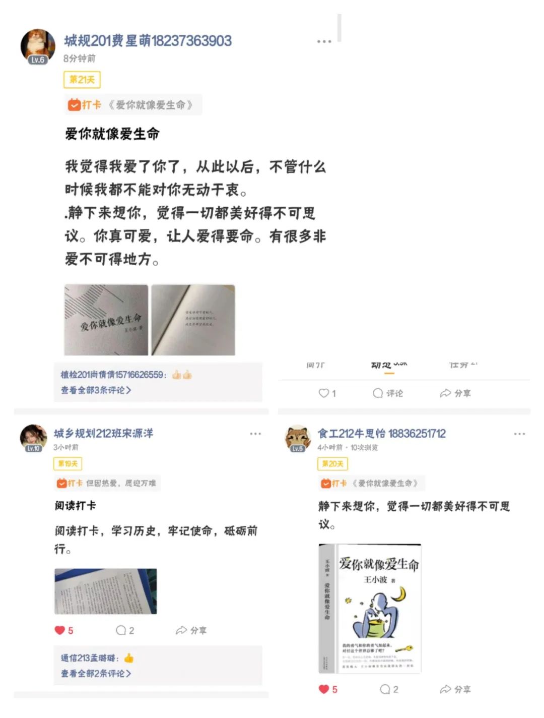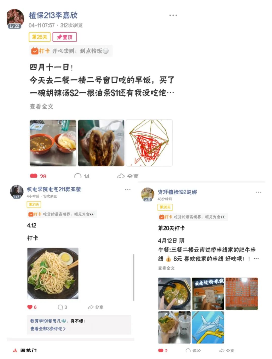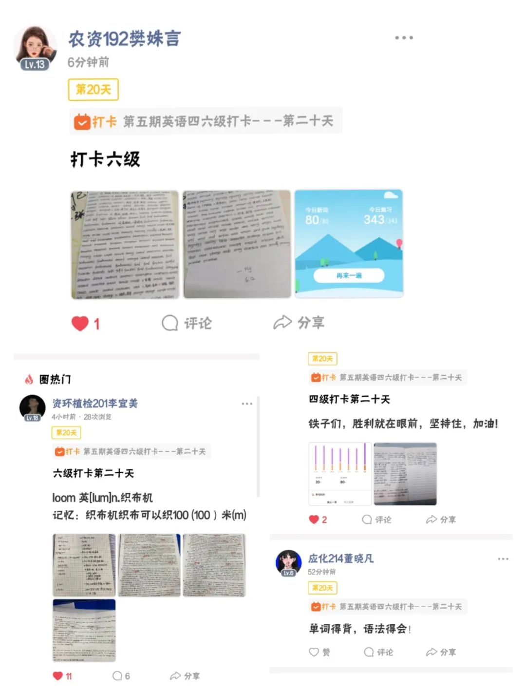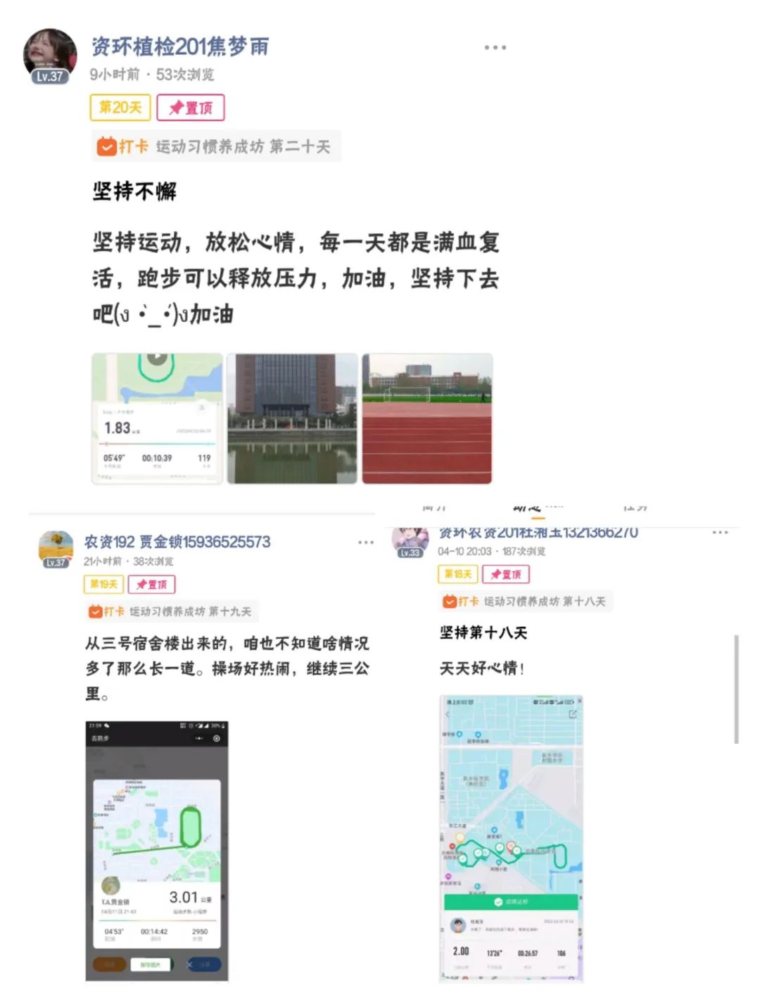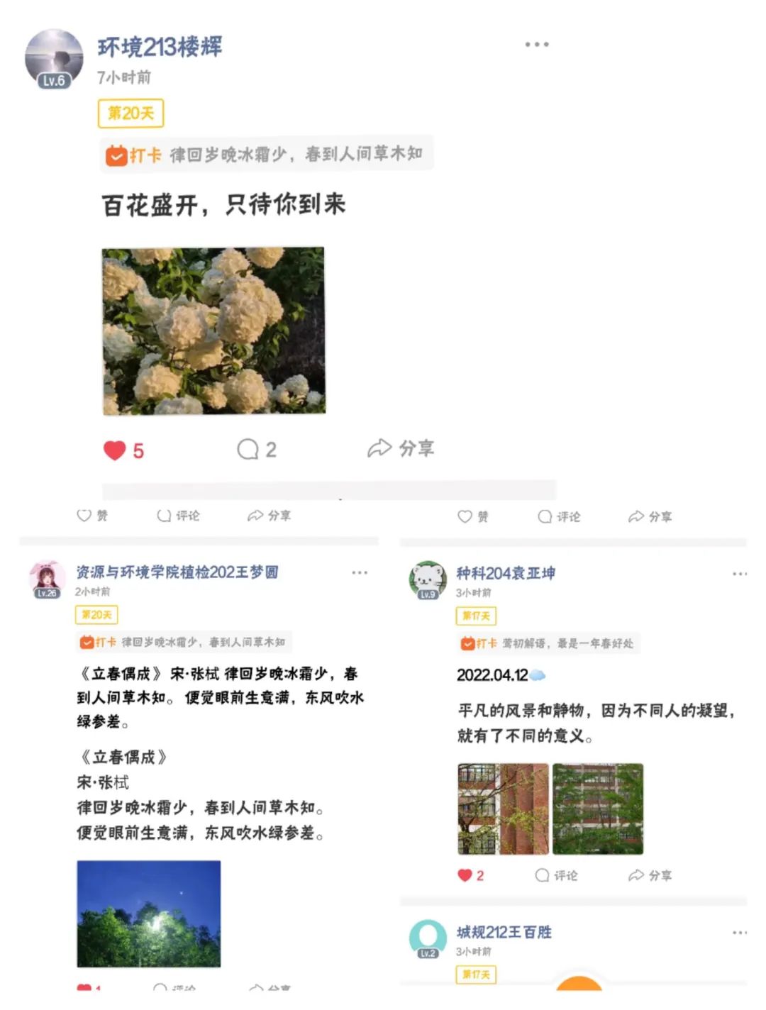 活动开展以来,累计参与人数为5000余人,发表了38000余条动态。同学们从最开始需要提醒,到后来的每日积极打卡,甚至本次活动结束之后,有些同学仍在积极打卡,大家早已形成了一种习惯。晨起阅读,于书中点缀昨日旧梦;与单词较量,每一天坚持的背后,是不灭的进取之心;即刻出发强身健体,没什么能够阻挡我的步伐;每日早起,用朝霞迎接美好的一天;分享美食,疗愈心情、治愈万物;携春色的浪漫邂逅校园的美景。