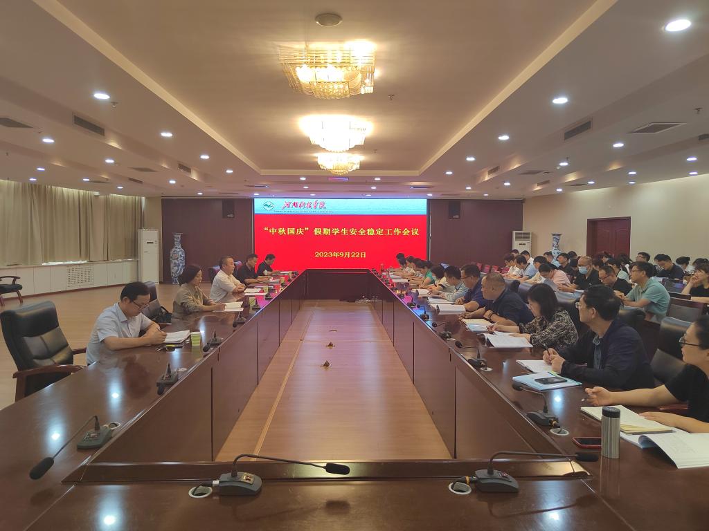 冀红举作总结讲话,他围绕“中秋国庆”假期学生宿舍安全、交通安全、旅行安全、心理安全、防电信诈骗安全、网络信息安全等主题,结合工作实际,提出三个落实到位:一是围绕贯彻落实省委书记楼阳生同志以及校党委书记宋亚伟同志关于学生安全稳定工作的指示批示精神,把毛杰厅长提出的“做好秋季开学后安全稳定10项重点工作”落实到位;二是围绕会议主题,把各项安全工作措施落实到位;三是围绕组织学习《安全稳定工作材料汇编》,向同行学习、向案例学习,把好经验好做法在具体工作中落实到位,确保“中秋国庆”假期校园秩序安全稳定。