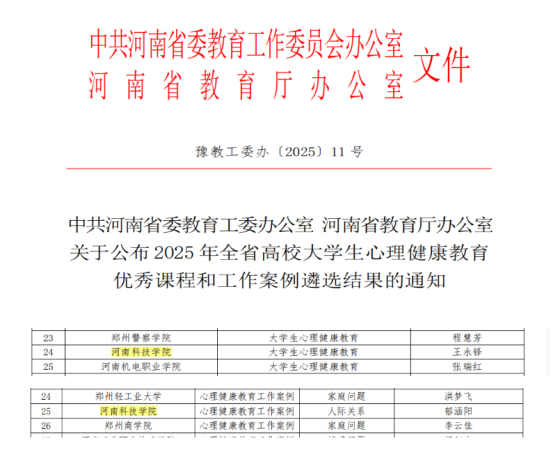 近日,根据河南省委教育工委、河南省教育厅《关于公布2025年全省高校大学生心理健康教育优秀课程及心理危机干预案例评选结果的通知》(豫教工委办〔2025〕11号),我校教师王永铎提交的《大学生心理健康教育课程》:“调适情绪 健康你我——从积极心理学的角度认识我们的情绪”成功入选河南省高校心理健康教育优秀课程;经济与管理学院教师郁涵阳提交的《宿舍“小矛盾”衍化的“大危机”—— 一例由宿舍矛盾引发的意外伤害及心理危机干预报告》成功入选河南省高校心理健康教育工作优秀案例。