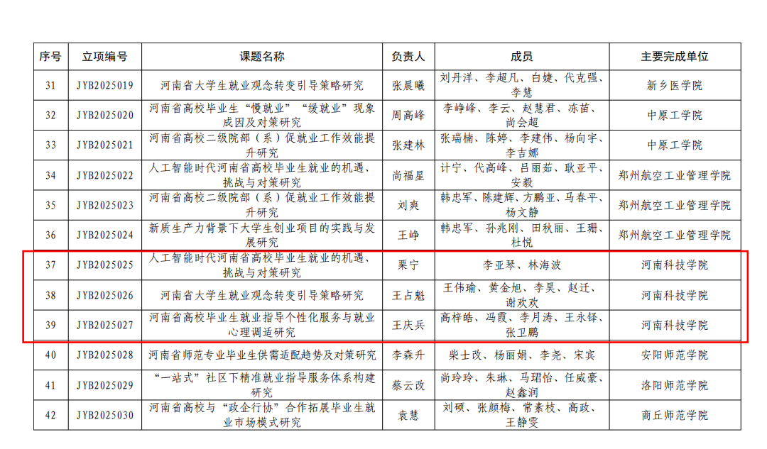 近日,河南省教育厅办公室公布《关于公布2025年全省普通高校就业创业课题立项名单的通知》(教办学〔2025〕140号),我校3项课题获得一般课题立项,展现了学校在就业创业工作中“以研促教、以研促行”的创新实践。