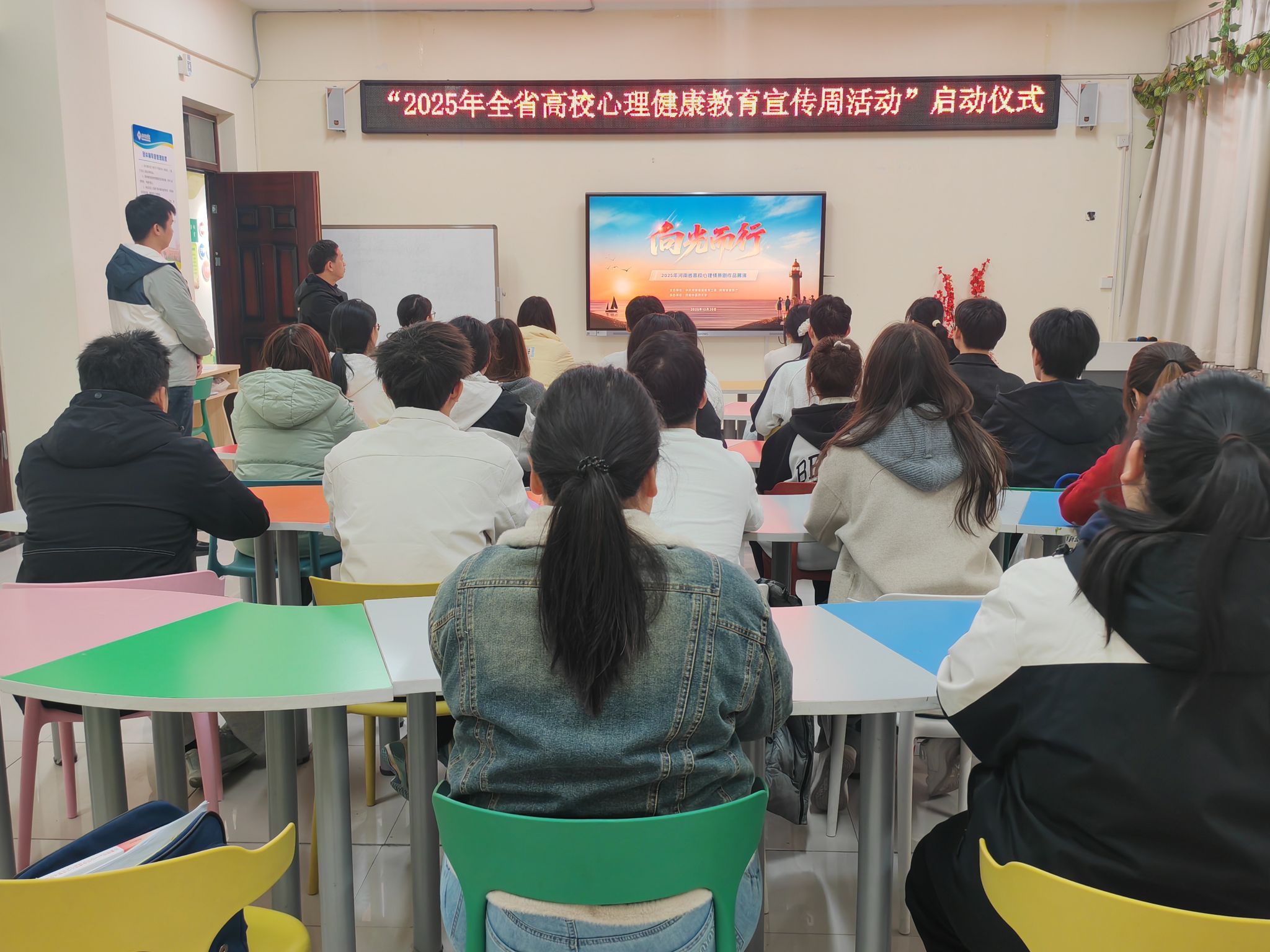 为深化心理育人成效,提升学生心理健康素养,10月20日晚,学校在心理健康教育与指导中心及各学院设立分会场,组织师生观看“2025年全省高校心理健康教育宣传周活动”启动仪式暨心理情景剧展演,拉开了我校2025年心理健康教育宣传月活动的帷幕。