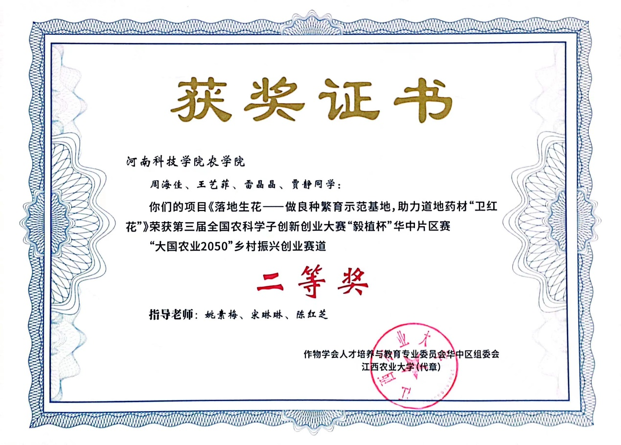 近日,第三届全国农科学子创新创业大赛华中片区赛在江西农业大学举行,经过激烈角逐,由我校农学院副院长姚素梅教授等指导,研究生周海佳、王艺菲、雷晶晶、贾静参加的《落地生花——做良种繁育示范基地,助力道地药材“卫红花”》,荣获“大国农业2050”乡村振兴创业赛道二等奖。