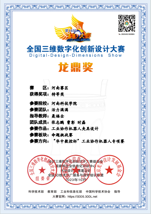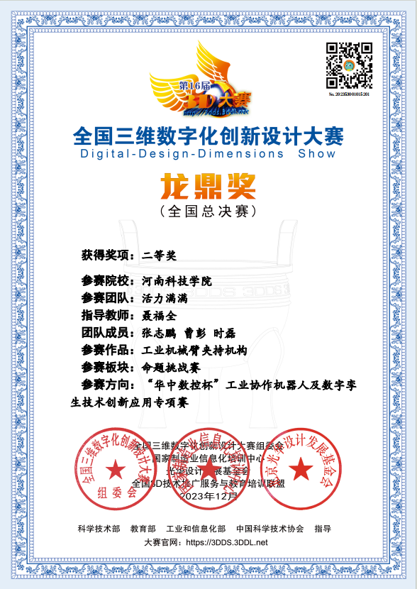 近日,第十六届全国三维数字化创新设计大赛全国总决赛在华中科技大学举行。本次赛事由国家制造业信息化培训中心、全国3D技术推广服务与教育培训联盟(3D动力)联袂华中科技大学发起并举办,华中科技大学工程实践创新中心、国家智能设计与数控技术创新中心承办。来自全国90多所院校、120个团队、300余名选手参加了专项赛年度总决赛。经过激烈角逐,由我校机电学院院长聂福全教授指导,机电学院研究生张志鹏、曹彭、时磊在全国总决赛中喜获全国三维数字化设计大寒“龙鼎杯”二等奖。同时,该团队在河南省第16届全国3D大赛“华中数控杯”工业协作机器人及数字孪生技术创新应用比赛年度总决赛河南省赛区,取得了全省第一名的好成绩,并荣获省特等奖。