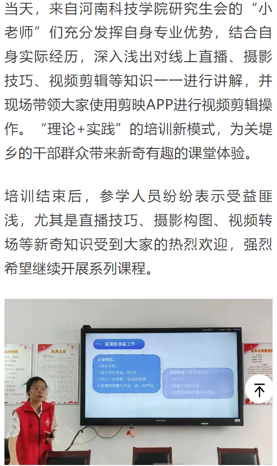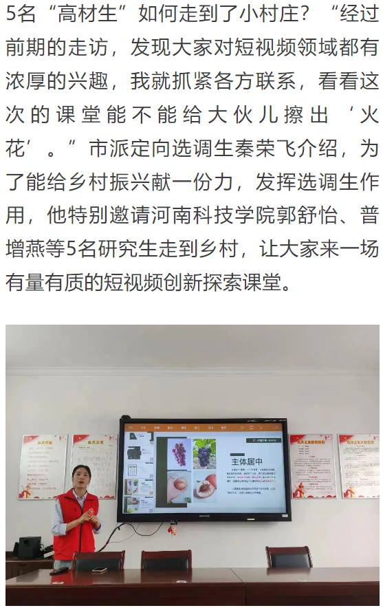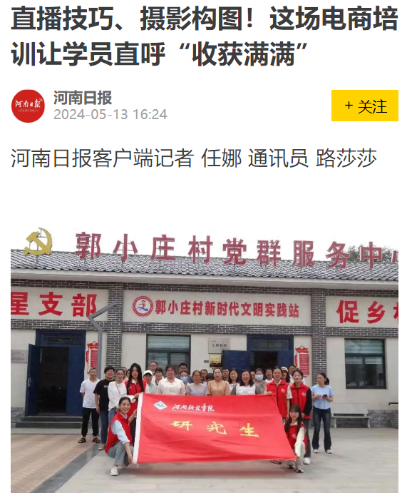 近日,河南日报网站对我校郭舒怡、普增燕等5名研究生到新乡高新区关堤乡郭小庄村开展的助农电商培训志愿服务活动进行宣传报道。