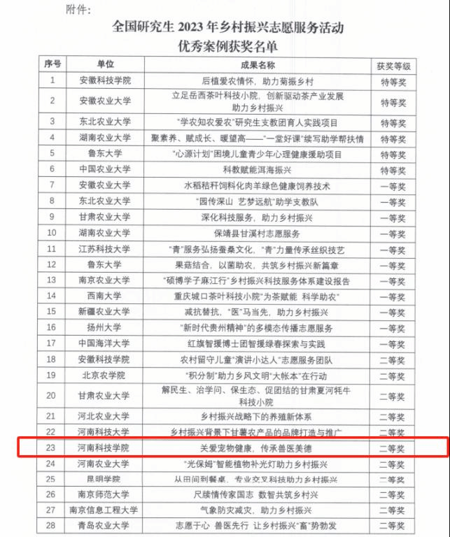 为选树典型引领示范,带动更多研究生在服务乡村振兴中“解民生、治学问”。全国农科研究生志愿服务联盟联盟秘书处联合成员单位开展全国研究生2023年乡村振兴志愿服务活动优秀案例征集工作。活动共评选出特等奖6项、一等奖11项、二等奖22项。活动期间,研究生处(研究生工作部)高度重视、精心组织,我校研究生积极响应、踊跃参与,其中动物科技学院研究生“关爱宠物健康,传承兽医美德”荣获优秀案例二等奖。