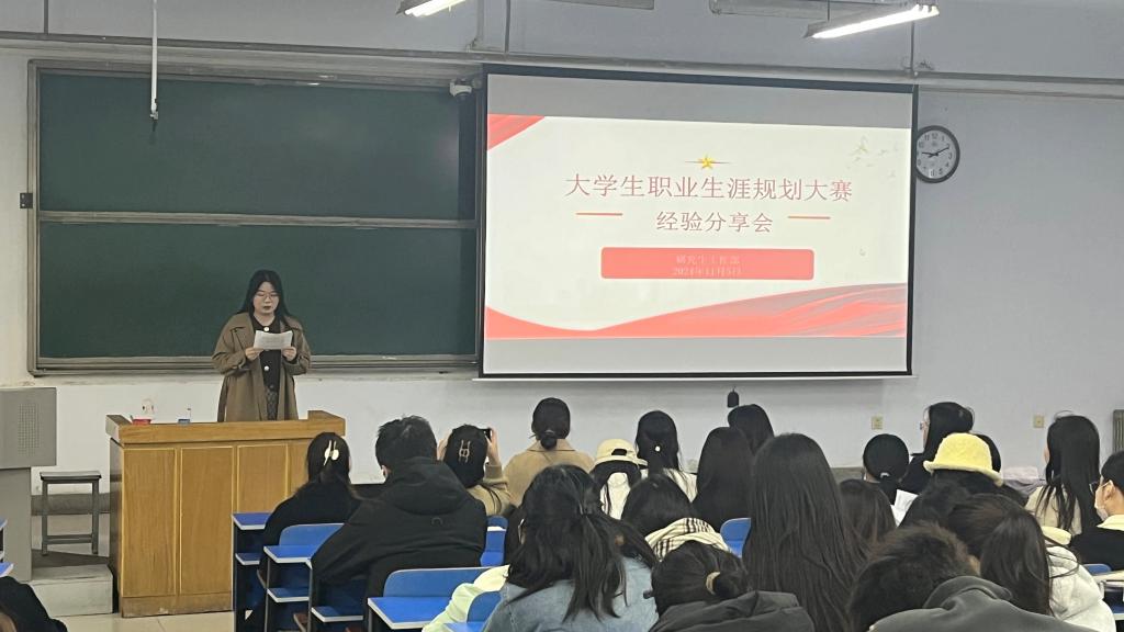 为增强研究生职业规划意识,提高参加职业规划大赛质量,11月5日,党委研究生工作部举办研究生职业规划大赛经验分享会。研究生工作部副部长朱宏,研究生辅导员李盼盼及全校160余名研究生参加了分享会。