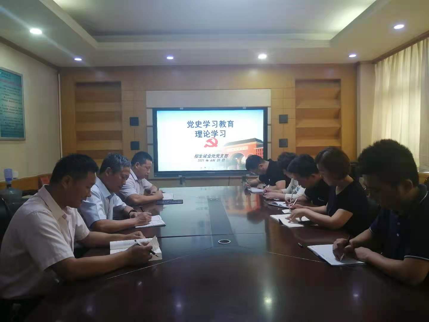 6月25日下午,招生就业处党支部在处会议室举行党史学习教育理论学习会,全体党员参加会议。